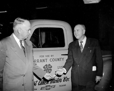 Ernest Allen, left, presents the key to a 1951 Chevrolet pickup truck to Tarrant County Agricultural Agent Jack McCullough. The truck will be used in 4-H Club work. Allen, owner of Ernest Allen Motor Company, made the presentation during a brief ceremony.