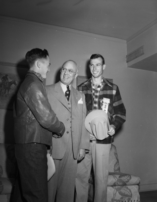 George Wallace, left, master counselor of the Fort Worth DeMolay Chapter, and Bob Condon, right, DeMolay state senior counselor, gave a western welcome to their "dad", Frank S. Land arrived from Kansas City for the first annual meeting in Texas of the order's Grand Council. Published in Fort Worth Star-Telegram evening edition, March 4, 1950.