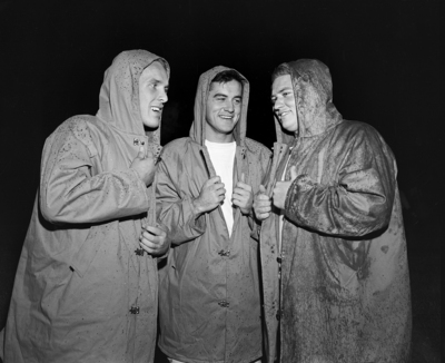 It's wet out but football practice goes on anyway at Texas Christian University. This is Defensive End Wayne Martin, Offensive Guard Jack Ramsay and Defensive Tackle Bill Mattern during a short "break" at the drill. Published in Fort Worth Star-Telegram morning edition November 27, 1951.