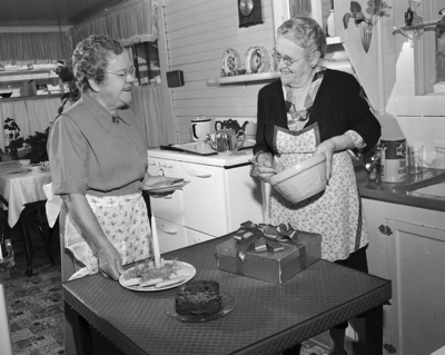 Mrs. W. E. Hedgecoth, left, and Mrs. W. H. Nordman baking Scotch Goodies in the kitchen.