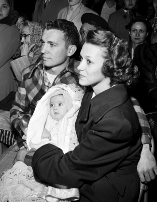 Five-month-old Royce Elain Tompkins appears spellbound in this photo, snapped in Burk Burnett Park as the giant tree was lighted at the Star-Telegram Christmas Tree and Music Festival. With her are her parents, Mr. and Mrs. Milton Tompkins of Lake Worth.