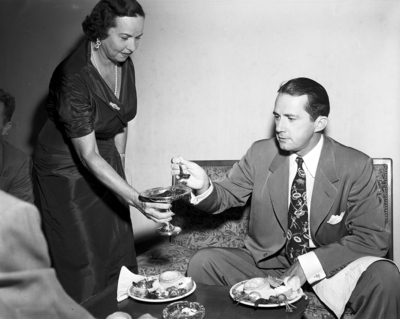 Edith McKanna helped redecorate the Snyder Country Club interiors, where she is shown here serving dessert to Governor Allan Shivers.