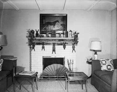 Image shows Edith McKanna's guest house. There is a fireplace in the guest house with bootjacks hanging on the mantel.