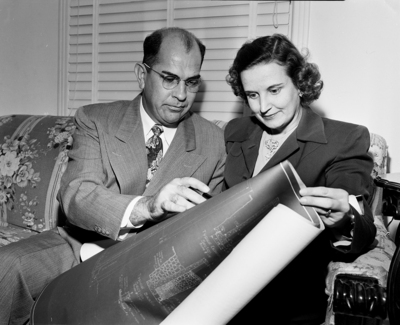 James L. Standridge, Church of Christ minister, who has an outstanding record for building congregations and churches for his faith, explains blueprints to his wife, Ruth J. Standridge for his latest venture, the new Ridglea West Church of Christ.