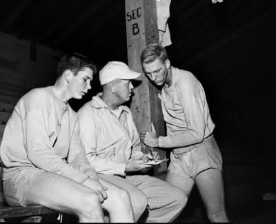Coach Bryon S. (Buster) Brannon gives last-minute instructions to Ross Hoyt, left, and Henry (Hank) Ohlen, only two sophomores on Texas Christian University traveling squad for cage opener. Published in Fort Worth Star-Telegram evening edition, November 28, 1951.