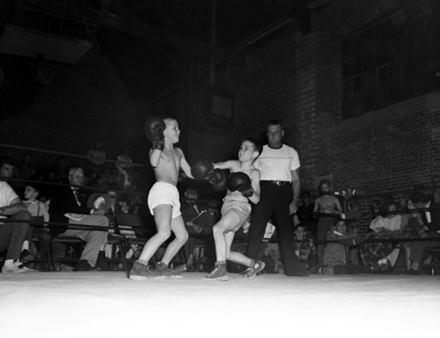 Jerry Waites, left, and Jackie Ashby mix it up in the Featherweight Gloves at the Panther Boys Club. Waites, 75, won the decision over his 71-pound opponent. Published in Fort Worth Star-Telegram morning edition November 29, 1951.