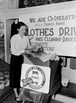 Mrs. Laverne McCuller of 3935 Willing is seen gathering clothes to make her contribution to used clothing drive. The garments will be cleaned and pressed by members of the Qualified Dry Cleaners Association and distributed to the needy for Christmas.