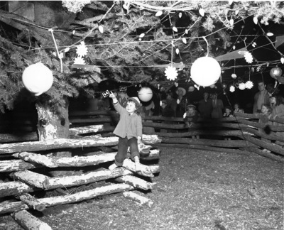 Sandra Kay Hill, 5, pointing to one of ornaments on Christmas tree in Burk Burnett Park, Fort Worth.