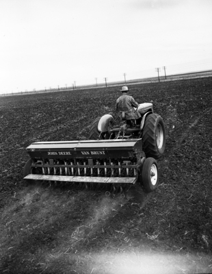 Image from the cover of the April edition of the Fort Worth Star-Telegram's Ranch and Farm News edition. A man can be seen driving a tractor through a field. Published in April, 1951.