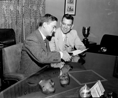 John Reeves, left, former president of the Fort Worth Cats embossing document that Bobby Bragan, baseball legend is holding.