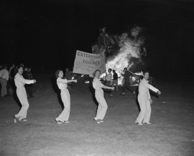 Image shows the bonfire at Texas Christian University that is had during Homecoming. Four cheerleaders are shown cheering while two hold a banner that reads, 'Exterminate The Equines'.
