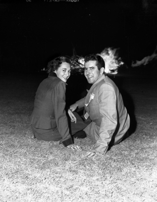 Image shows Lindy Berry, right and Mary Sowartz, left attending the Texas Christian University homecoming bonfire.