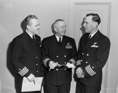Rear Administration Lucian Ancel Moebus, chief of the U. S. Naval Air Reserve Training Command, center, looks over his program at Grand Prairie. At right is Captain Hugh R. Nieman Jr., commander of the Grand Prairie Naval Air Station.