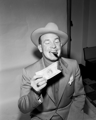 Image shows McDonald King, with a cigar in his mouth holding a fake thousand dollar bill that is lit. Written on the bill is 'I want that Shrine ring'.