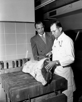 The meat cutter's block in the newest Safeway Store is loaded with sirloin steaks. Alton Puddy, right, market manager, prepares to make a cut. Observer at left is Glen A. Calhoun, store manager.