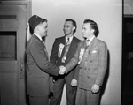 Bradley Mitchell, left, of the Fort Worth Chapter of DeMolay, welcomes H. B. (Curly) Lindsey, middle, of Orange and David Hendrix of Dallas to the Grand Council of the International Order of DeMolay session here. Lindsay is state master councilor and Hendrix is state marshal. Published in Fort Worth Star-Telegram morning edition, March 6, 1950.