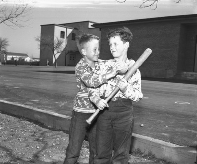 Vernon Thompson, left, third grade pupil at B. H. Carroll Elementary School, introduces baseball to Andrzej Slupski, the first displaced person to enter the elementary schools of Fort Worth. 03/06/1950