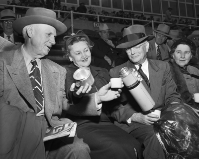 Taking part in Texas Christian University Homecoming are, left to right Mr. and Mrs. Tom Gillis and R. C McConnell. They are enjoying a hot beverage.