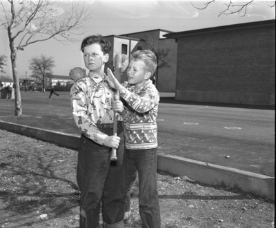 Vernon Thompson, right, third grade pupil at B. H. Carroll Elementary School, introduces baseball to Andrzej Slupski, the first displaced person to enter the elementary schools of Fort Worth. 03/06/1950