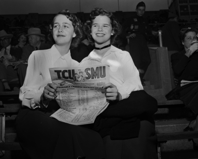Taking part in Texas Christian University Homecoming are left to right Lynda McKinney and Mrs. Roscoe Champion holding a program of the homecoming game against SMU.