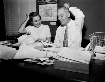 Image shows Mary Schwartz, secretary, left and Amos Melton, right, seated at desk pretending to pull their hair due to the Cotton Bowl ticket requests flooding in at Texas Christian University (TCU). Melton, the business manager of athletics said they had two baskets full of requests and just one "shoe box" full of tickets. TCU, Southwest Conference champion, play Kentucky in the Cotton Bowl.