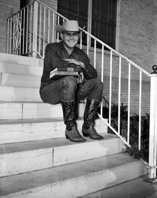 Keith Flowers in western outfit relaxes on steps, a linebacker and co-captain of Texas Christian University Frogs.