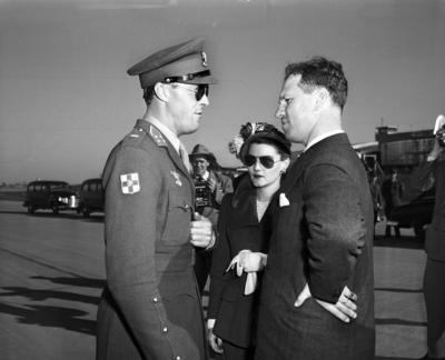 Military man speaks to man in suit.