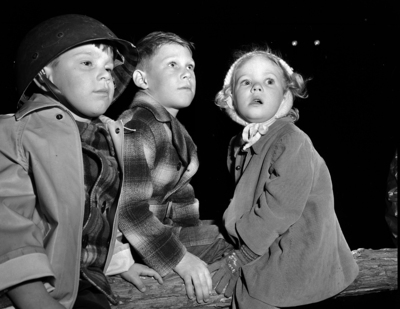 The towering Yule tree in Burk Burnett Memorial Park held the rapt attention of George W., left, and Phillip G. Smith, sons of the W. G. Smiths of 627 Caddo, and Nancy Ellen Smith, Daughter of the Robert Terry Smiths of 2004 Blue Bonnet Drive.