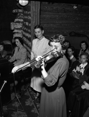 Miss Louis Ruth Mitchell, director, and Sylvia Parker, violinist, when the Paschal High School girls' glee club serenaded the tree audience. Betsy and Gregg Brooks and their mother, Mrs. R. J. Brooks of 1408 Robin Wood Drive, visit the tree.