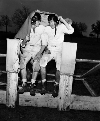 Sitting on the Arlington Heights blocking sled, End Lane Everett, left, takes shelter under Fullback Maurice Jones' raincoat during a brief drizzle.