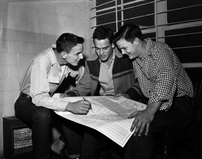 Three Arlington Heights reserve linemen-Byron Searcy, left, Arthur Smallwood, center, and David Cooper-locate Lubbock on the map, site of their team's semifinal playoff game. Searcy is a guard, the other two tackles.