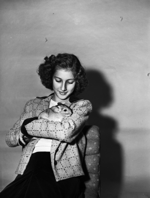 Carol Daugherty of Rendon, daughter of Mr. and Mrs. Charles Daugherty, admires 3-month-old chinchilla owned by her grandfather, F. L. Tomlinson, who will enter several in the second annual Chinchilla Roundup at Hotel Texas. Approximately 200 chinchillas will be entered in the contest for grand champion of Texas. Published in the Fort Worth Star-Telegram, December 7, 1951.