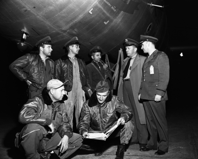 First B-36 crew to land at Carswell Air Force Base on the return trip from Morocco is shown here. Squatting, left to right, are Lieutenant James Spearman and Captain Clement Maloney, plane commander. Standing, left to right, Captain Walter G. Demond, Captain H. R. Holley, Captain P. Komlenich, M. J. Burns of Dallas, U. S. Customs inspector, and Colonel Louis W. Rohr, deputy commander of the 11th Bomb Wing.