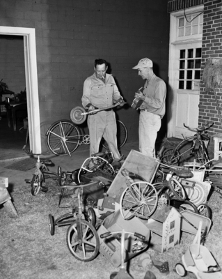 Firemen at the Avenue I and Bishop station are asking for more old toys that can be repaired and repainted for needy children. O. H. Lee, at left, and Captain J. C. Fincher look through toys that have been turned in for repair and redistribution. The toy project sponsored by the East Fort Worth Lions Club.