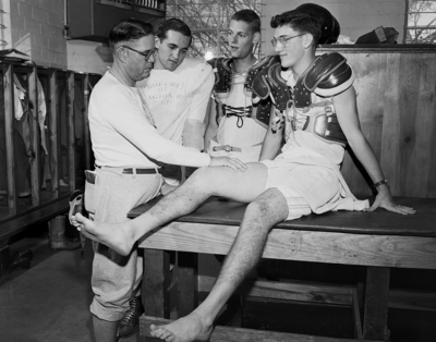 Coach N. J. Hogan of Arlington Heights checks Fullback Alfred Frantz' ailing leg as Tackle Bob Wilkes, left, and Center Robert Howington look on. Frantz is not expected to play against Lubbock. Published in Fort Worth Star-Telegram evening edition December 7, 1951.