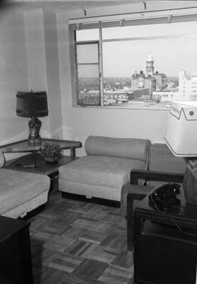 Fortune Arms Hotel, Burnet and W. 1st Street, Fort Worth; corner of living room with the Tarrant County Courthouse framed in the window, 12/07/1951