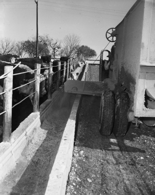 Series on Green Valley Feed Lots near San Marcos. Assembly-line feeding at Green Valley is shown as a feed truck rolls along the runway with its conveyor distributing specially mixed feed to the beef cattle.