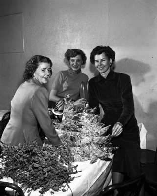 Misses Mary Frances Wallace, Estella Baker and Laura Wells, left to right, members of the dance committee, decorated the Venetian Ballroom of the Blackstone Hotel with Christmas trees for the annual Christmas dance of Beta Sigma Phi sorority.