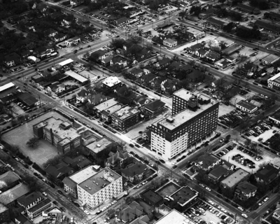 Air view of Fortune Arms, 11- story apartment hotel at 1st, 2nd and Burnet streets. It will has 234 apartments and 14,500 square feet of commercial spaces on the ground floor. The exterior of the building is faced with cream bricks on the 2nd street side from the first through the 7th floors. Remainder of the building is finished in chocolate brown bricks.