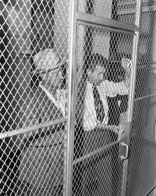 When third floor hands get rushed at deadline and lose their tempers, the new cage in the Men's Lounge serves as a cooling off room. Shown trapped are Harry Heinecke, right, and Phil Edwards, left. C. L. Richhart is only hand so far to spend entire night in the new room. Charlie Boatner, it is rumored, locked him in to be sure Rich would make next day's deadline.