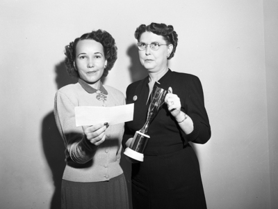 Mrs. E. G. Young, right, makes a double check of the Epsilon Sigma Alpha $1,250 contribution to the Goodfellow Fund derived from proceeds from the sorority's Goodfellow ball and queen contest. Mrs. Young, a member of Zeta Delta Chapter, was queen runner-up. Mrs. Alfred Irby is shown with the trophy the Gamma Chi Chapter won for selling the most ball tickets. Mrs. Irby is chapter president.
