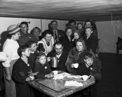 Displaced persons, part of the 51 who ate breakfast at St. Patrick's Catholic Church, are served coffee by Mrs. Joseph Bandor (center). At left is Mrs. G. L. Guthrie. Both are local members of the Deanery of the National Council of Catholic Women.