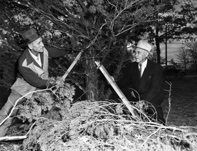 Preparing the tree for the community festivities at Forest Hill, left to right, J. H. Gandillon of 6204 Forest Hill Dr., on whose property the tree is located, and S. E. Bostwick, president of the Forest Hill Civic League, the sponsoring organization.. Published in the Fort Worth Star-Telegram, December 10, 1951.