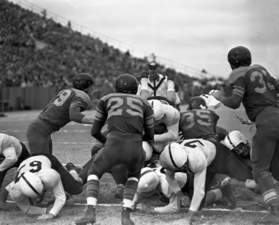 His heels higher than his head, James Sides, Lubbock fullback, breaches the Arlington Heights line for the first touchdown at Lubbock. The play covered a yard. Defenders are Richard Clowe (25), Joe Keeton (35), Jim Pruitt (33). Published in Fort Worth Star-Telegram morning edition December 9, 1951.