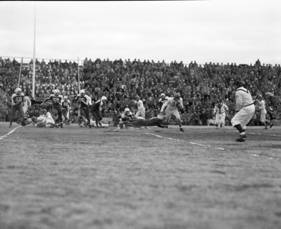 Here's an example of the broken-field running Temple must cope with the 3A state high title game in Abilene. Ted Vickers (38), Breckenridge halfback, is eluding a Grand Prairie tackler in semifinals. Behind Vickers is Ted Lancaster. Number 41 is Warren McFall. Published in Fort Worth Star-Telegram morning edition December 12, 1951.
