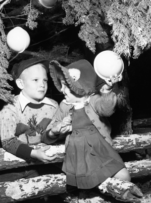 Kaye, 9, and Nancee, 4, daughters of Mr. and Mrs. T. L. Maples of Graham, also inspect the ornaments on the giant tree.