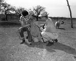 Image shows Myron Hillman, left, a Mullin Highschool student, with Don Clark, right , the schools vocational agriculture teacher, as the two examine a sheep at the Hillman farm. Published in the June edition of the Fort Worth Star-Telegram's Ranch and Farm News, 1951.