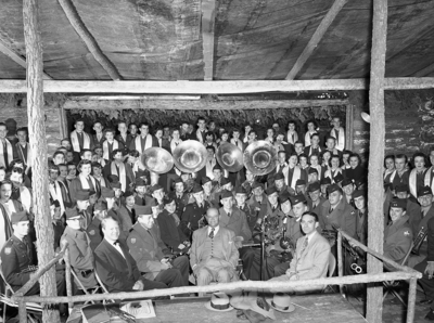 Vocal and instrumental groups from Arlington State College- the mixed chorus and band- at Carol Cabin, when they provided a hit program for the Star-Telegram Christmas Tree and Music Festival in Burk Burnett Memorial Park. In foreground, left to right, are Dan Burkholder, choir director; Colonel Earl D. Irons, head of the fine arts department, and James W. West, band director.