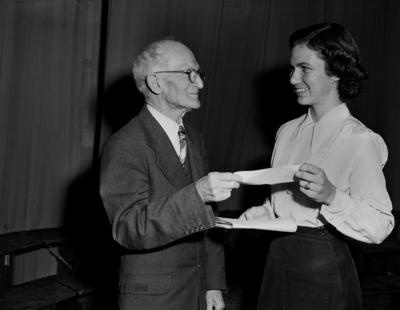 Annette Meeks, 16-year-old daughter of Mr. and Mrs. C. J. Meeks, is the winner of a city-wide contest for high school seniors sponsored by the Fort Worth chapter of Minute women of America. She received a $25 check from Sidney L. Samuels, a contest judge.