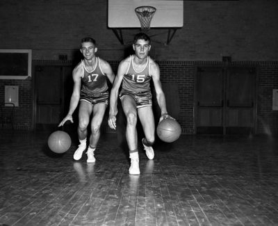 Jim McCulloch, left, and Johny Betts, junior forwards, helped Poly win fourth straight Hardin-Simmons cage tournament title over weekend. Published in Fort Worth Star-Telegram evening edition, December 11, 1951.
